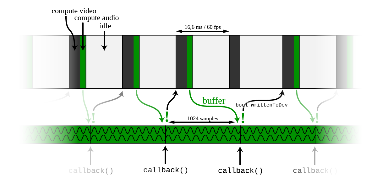 One extra reason is that we have some time to play our sound samples. We can calculate new samples for the buffer every frame. Every 16 milliseconds. We know that our audio holds 44,100 samples per second. So we need 44100 / 60 = 735 samples per frame. So the audio buffer has to hold at least that amount (per channel) to have enough data to send to the audio device before it time again to calculate new samples.