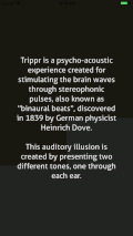 Trippr is a psycho-acoustic experience created for stimulating the brain waves through stereophonic pulses, also known as binaural beats, discovered in 1839 by German physicist Heinrich Dove. This auditory illusion is created by presenting two different tones, one through each ear.